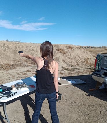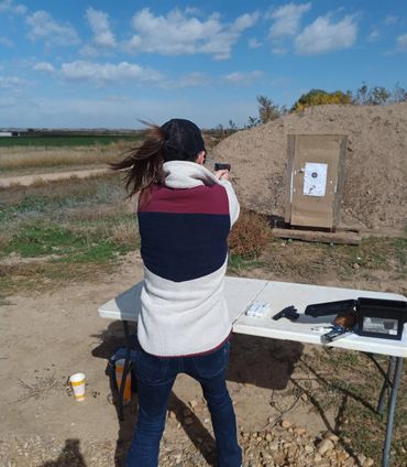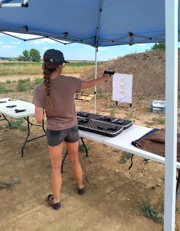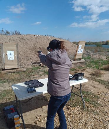Woman aiming a pistol at an outdoor shooting range with several guns on a table.