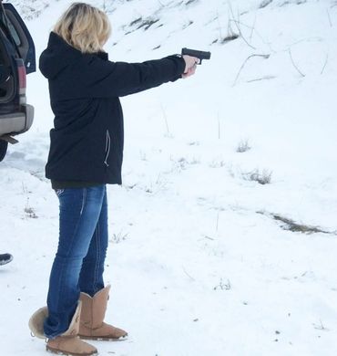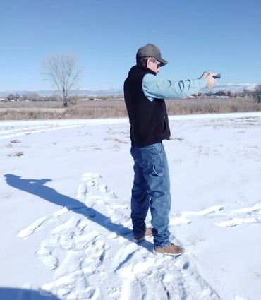 Man in winter clothes aiming a handgun outdoors in snow-covered area.